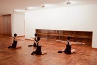 Der runde Türklopfer rechts auf der Tür wäre beim iranischen Vorbild der Frau vorbehalten, während die linke Seite mit einem länglichen Klopfer ausgestattet wäre und ausschließlich von Männern benutzt werden dürfte. Die patriarchale Tendenz des Ortes erfährt einen weiteren Reflex durch die zentral im Raum positionierte Skulptur aus der Serie der Kitab Kebab’s. Ein gewöhnlicher Kebabspieß durchdringt eine Reihe von Büchern, darunter auch den ersten Band von Klaus Theweleits Männerfantasien über das faschistische Bewusstsein und die soldatische Prägung des männlichen Ichs. Darüber hinaus sind hier Bände zusammengebracht, mit denen der frauenfeindliche, patriarchale Charakter modernistischer Architektur angesprochen wird.